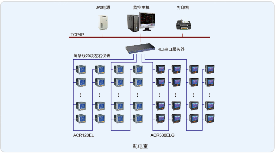 整個系統(tǒng)采用網(wǎng)絡(luò)分布式結(jié)構(gòu),監(jiān)控主機位于地下一層變電所值班室內(nèi),配電柜內(nèi)安裝有本公司ACR330ELH、ACR120EL儀表共計60多回路。仁恒河濱花園電力監(jiān)控系統(tǒng)現(xiàn)場共1個低壓配電室,配電室內(nèi)采用安科瑞ACR系列電力監(jiān)控儀表采集各回路的電流、電壓、電能等電參量,然后通過中間層采集設(shè)備網(wǎng)線到監(jiān)控室計算機上,實現(xiàn)遙測、遙信功能。