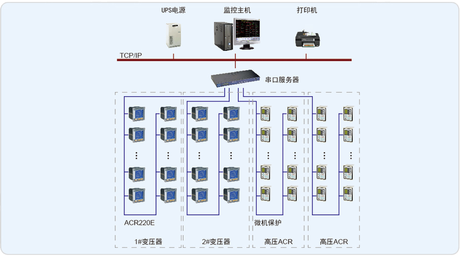蘇州金閶中學(xué)共有一個(gè)變配電室,整個(gè)配電系統(tǒng)主要有2臺(tái)10/0.4 kV配電變壓器和2排高壓進(jìn)線柜,共計(jì)62低壓4個(gè)10kV中壓進(jìn)出線柜,實(shí)現(xiàn)了對(duì)整個(gè)學(xué)校的電力供應(yīng)。本項(xiàng)目電能管理系統(tǒng)主要對(duì)變電所內(nèi)62個(gè)進(jìn)出線回路及10kV配電回路進(jìn)行管理,實(shí)現(xiàn)電力參數(shù)實(shí)時(shí)遙測(cè)、電能計(jì)量、電能報(bào)表等功能。