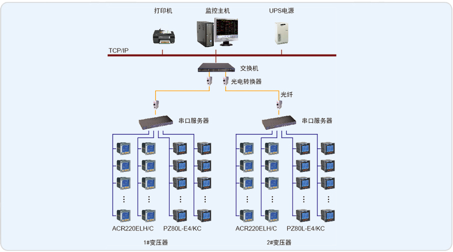 吳淞中心醫(yī)院電能管理系統(tǒng)監(jiān)控范圍變電所內(nèi)智能儀表的運行參數(shù),吳淞中心醫(yī)院共一個變電所,變電所內(nèi)有2路變壓器(1#變壓器、2#變壓器)出線及93路普通饋線。進線回路采用ACR220ELH多功能諧波儀表,普通饋線回路采用PZ96L-E4/C智能可編程電力儀表。整套電能管理系統(tǒng)站控管理部分包括監(jiān)控管理主機、打印機、UPS電源等;網(wǎng)絡通訊層部分包括一個16口的串口服務器;現(xiàn)場智能儀表監(jiān)控設備層由ACR220ELH和PZ96L-E4組成。該配電系統(tǒng)分布在一個變電所內(nèi),2臺變壓器的所有電力儀表通過RS485總線連接至串口服務器,并經(jīng)過超五類網(wǎng)線上傳至監(jiān)控后臺。