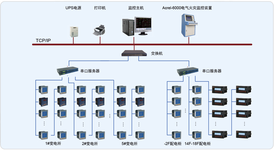 1)現場設備層主要為:多功能網絡電力儀表、開關量、模擬量采集模塊和智能斷路器等。這些裝置分別對應相應的一次設備安裝在電氣柜內,這些裝置均采用RS485通訊接口,通過現場MODBUS總線組網通訊,實現數據現場采集。