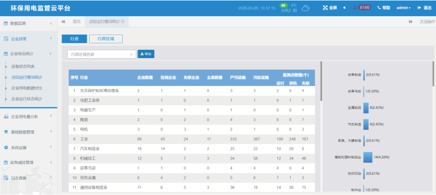 點位運行情況分析:按行業或區域統計分析企業、監測點、產污設施、治污設施等數量及運行狀態。