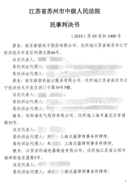 近日安科瑞收到江蘇省蘇州市中級人民法院(以下簡稱“蘇州中院”)的《民事判決書》((2018)蘇 05 民初 1000 號),就原告南京新聯電子股份有限公司、南京新聯電能云服務有限公司(以下簡稱“新聯公司”)與被告安科瑞電氣股份有限公司、江蘇安科瑞電器制造有限公司(以下簡稱“安科瑞”)侵害發明專利權糾紛一案作出判決。