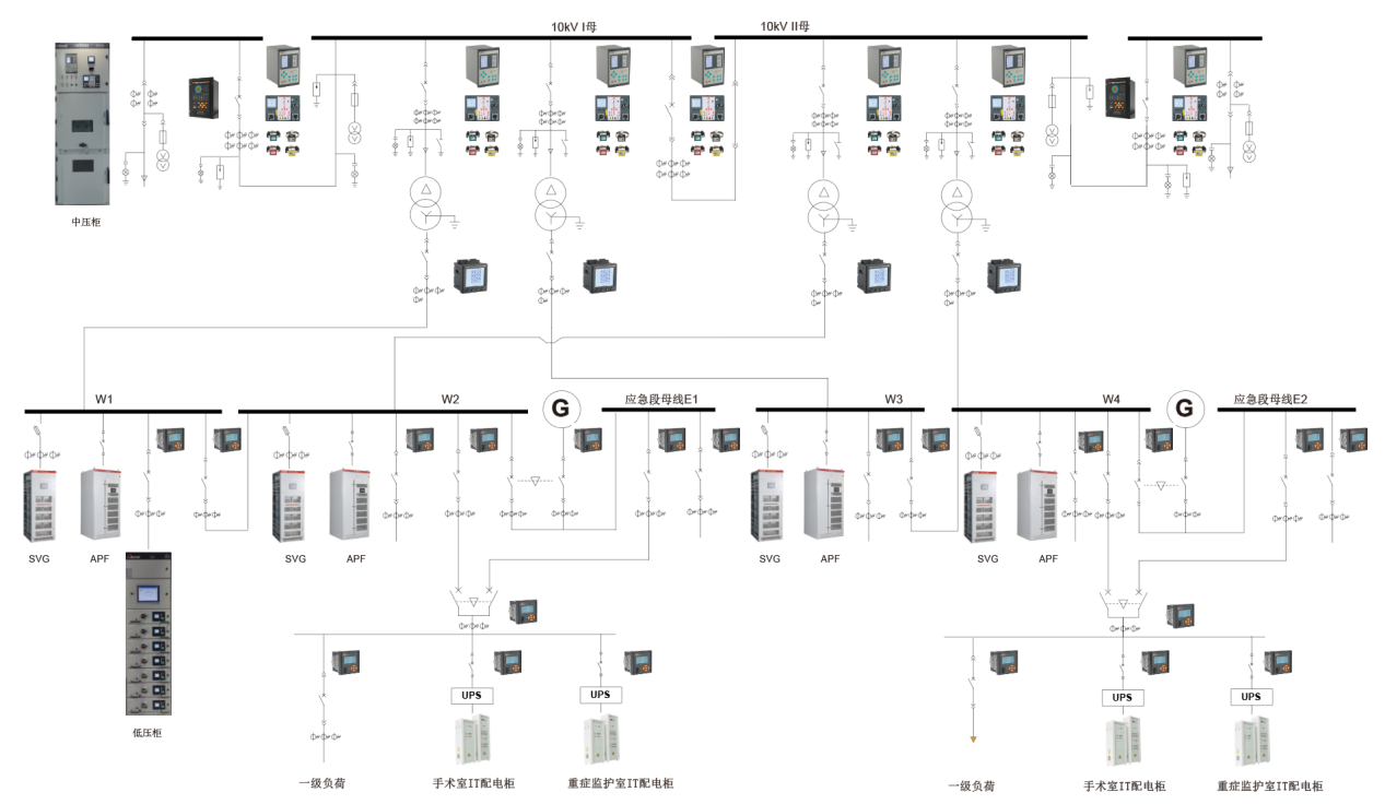 電力監(jiān)控系統(tǒng)主要針對開閉所和10/0.4kV變電所,對高壓回路配置微機保護(hù)裝置及多功能儀表進(jìn)行保護(hù)和監(jiān)控,對0.4kV出線配置多功能計量儀表,用于測控出線回路電氣參數(shù)和用能情況。同時對醫(yī)院重要設(shè)備如柴油發(fā)電機、無功補償裝置、有源濾波裝置、UPS、隔離電源系統(tǒng)狀態(tài)進(jìn)行監(jiān)測。