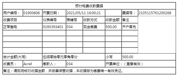 售電、退電、開(kāi)戶時(shí)系統(tǒng)支持三聯(lián)單單據(jù)打印的功能,單據(jù)格式默認(rèn)如下(可以由客戶確認(rèn)后自由定制):