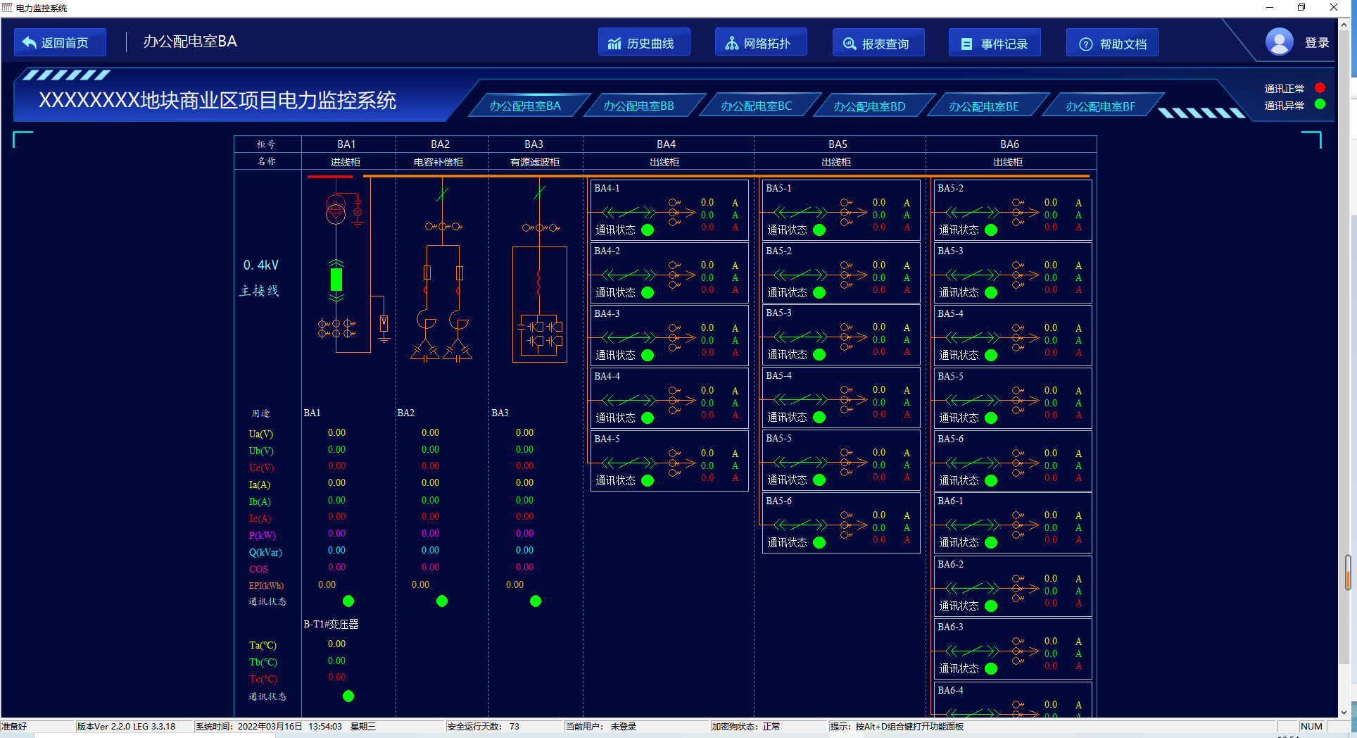 系統(tǒng)人機界面友好,以配電一次圖的形式直觀顯示配電線路的運行狀態(tài),實時監(jiān)測各回路電壓、電流、功率、功率因數(shù)、電能等電參數(shù)信息,動態(tài)監(jiān)視各配電回路斷路器、隔離開關(guān)、地刀等合分狀態(tài)、柴油發(fā)電機狀態(tài)、柴油液位、UPS狀態(tài)、電池信息等,以及有關(guān)故障、告警等信號。
