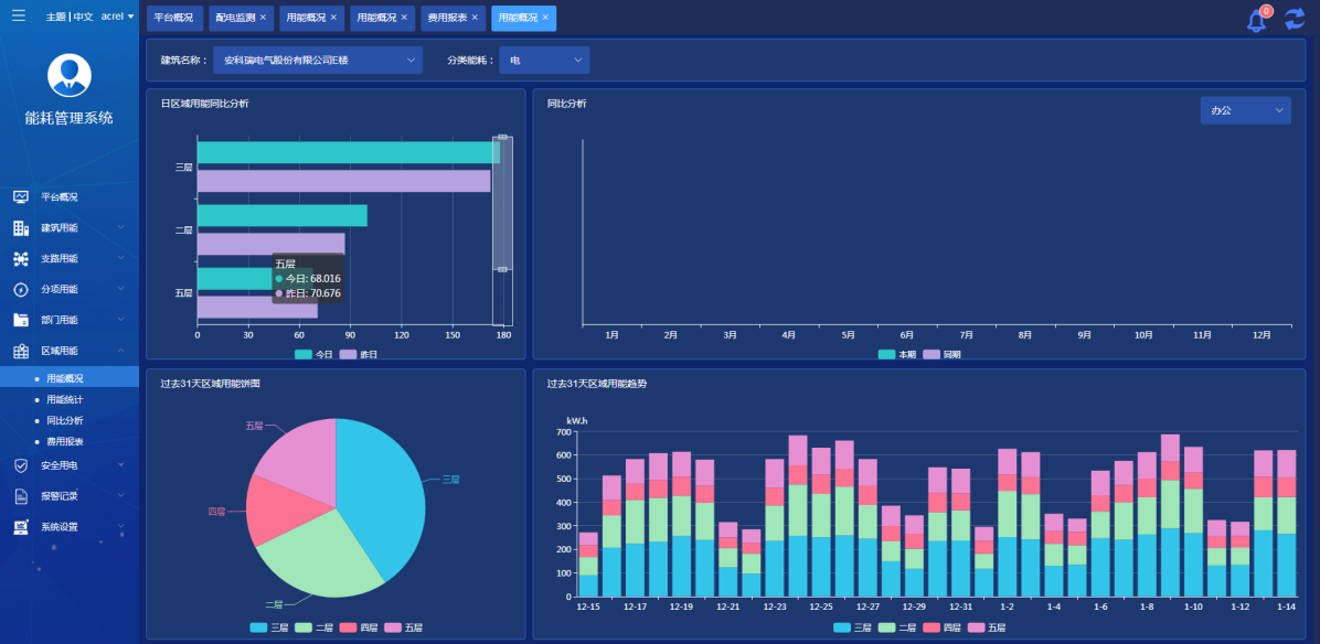 展示當前建筑各區域的用能情況,通過餅圖、柱狀圖顯示能源占比、同比對比以及分項用能趨勢,可按照樓、樓層等方式區分。