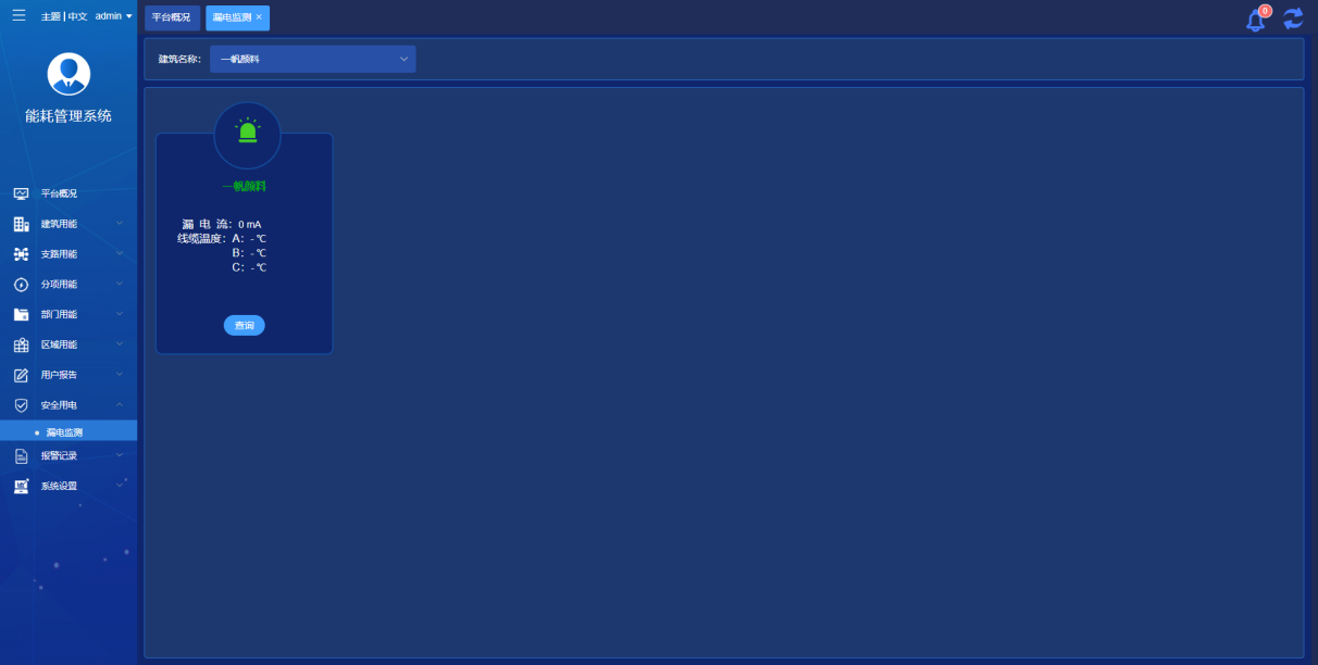 通過監測配電回路的漏電電流和線纜溫度來分析商業中心的用能安全。在商業樓、辦公樓、酒店樓層配箱進線和出線回路安裝漏電探測器和溫度傳感器,其它建筑進線處安裝漏電探測器和溫度傳感器。